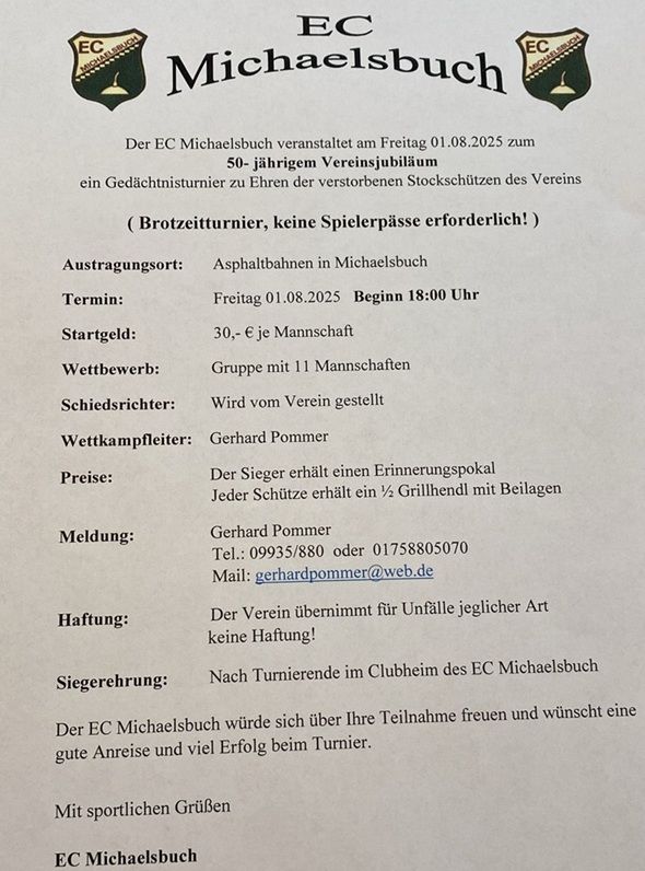 Am Freitag, den 01. August fand das Gedächtnisturnier zum 50. Bestehen des EC Michaelsbuch statt. 11 Mannschaften nahmen daran teil. Vorsitzender Franz Rösch begrüßte die Teilnehmer und bedankte sich beim Organisationsteam, beim Turnierleiter Gerhard Pommer und bei Schiedsrichter Martin Hinkofer. Sieger wurde der EC Rothammer Parkstetten (Horst Knispel, Andreas Schindler, Armin Foidl, Simon Wagenlehner) mit 19:1 Punkten vor dem EC Michaelsbuch mit 14:6. Dritter wurde der EC Moos mit 13:7, 4. der MDSC Plattling 12:8 +22, 5. EC Zaundorf 12:8 +6, 6. TSV Hengersberg 11:9, 7. EC Wolfstein 10:10, 8. EC Haidmühle 6:14 -6, 9. EC Teisnach 6:14 -45, 10. EC Bernreid 5:15, 11. SV Pankofen 2:18.